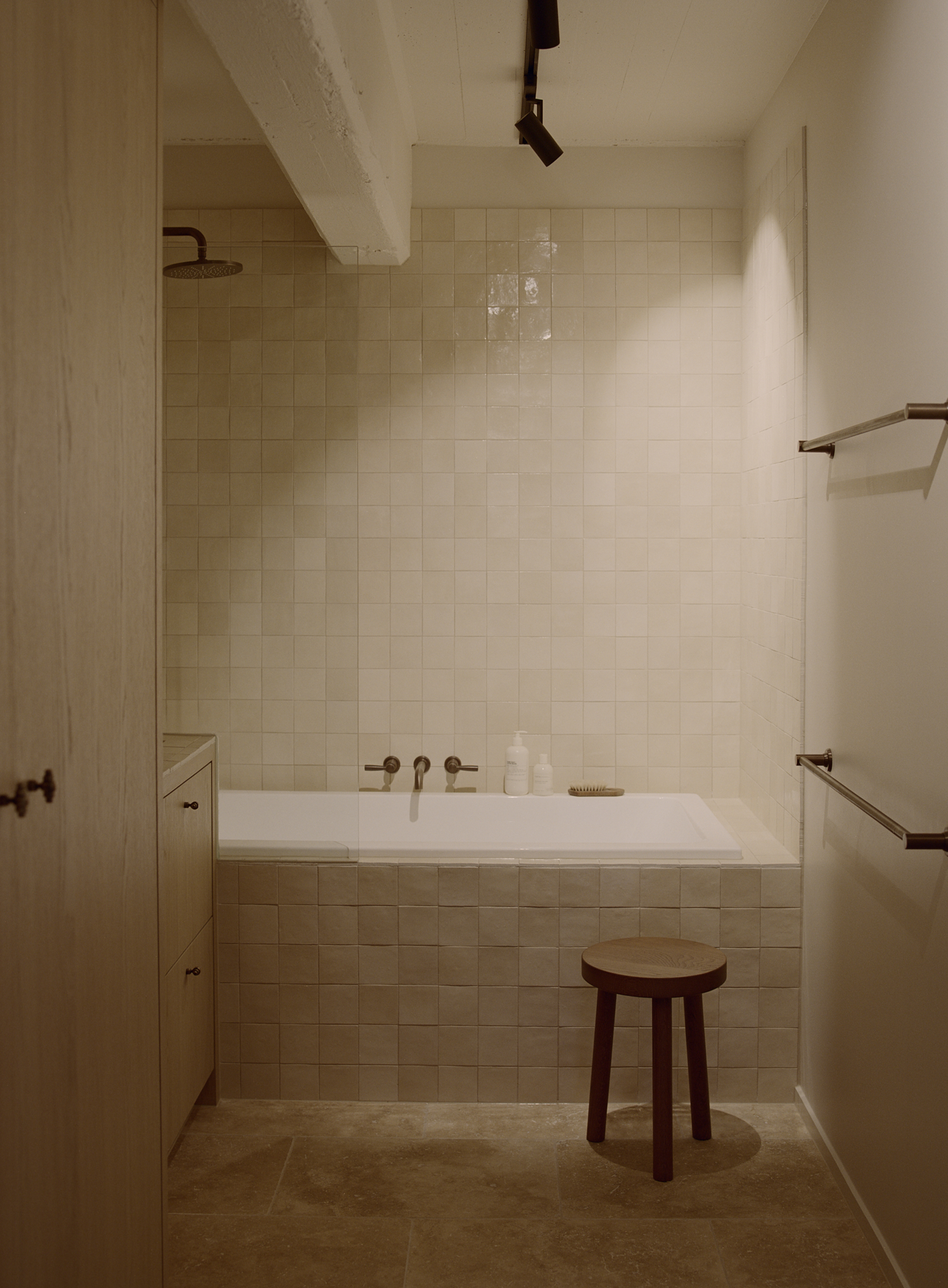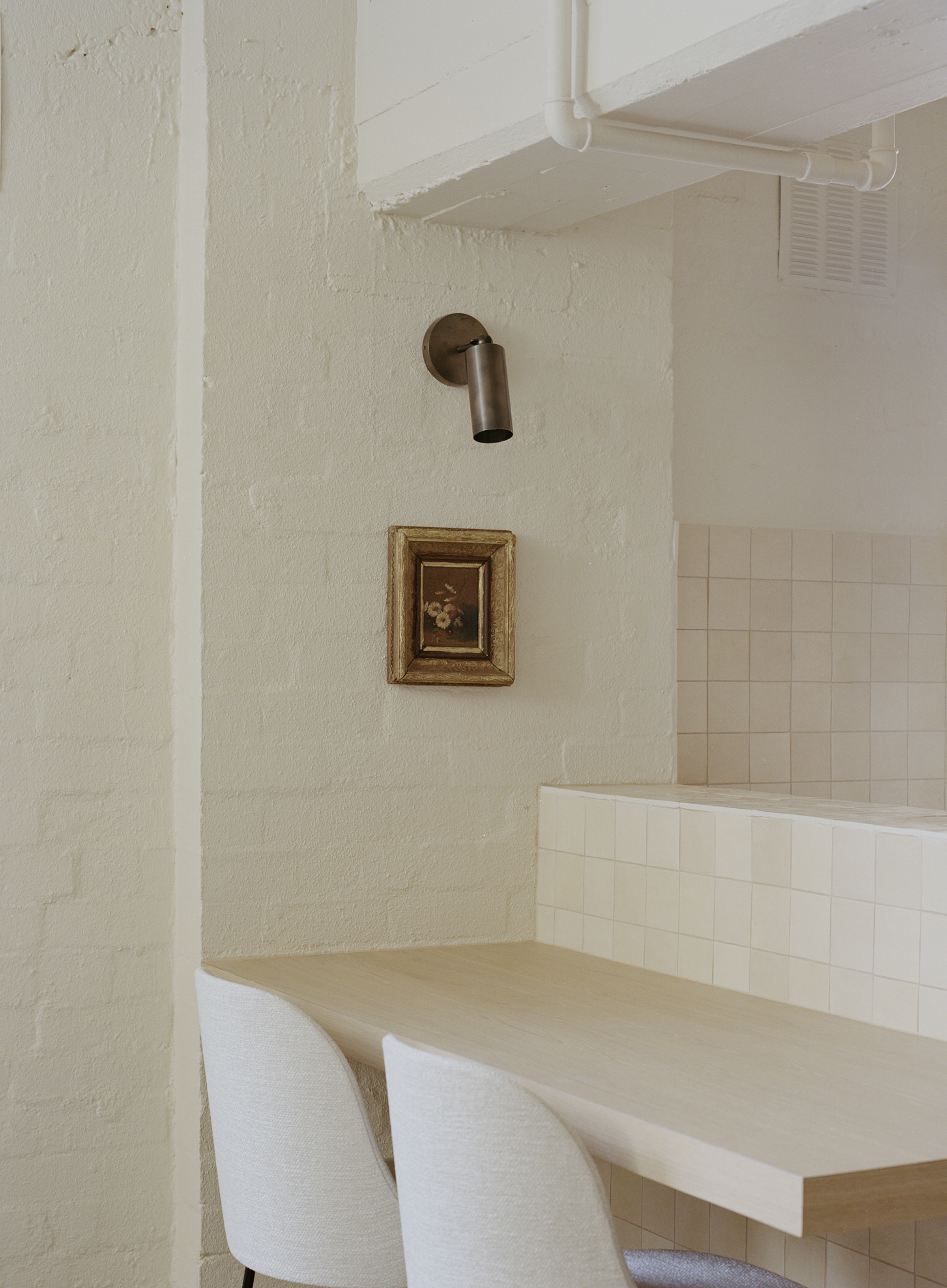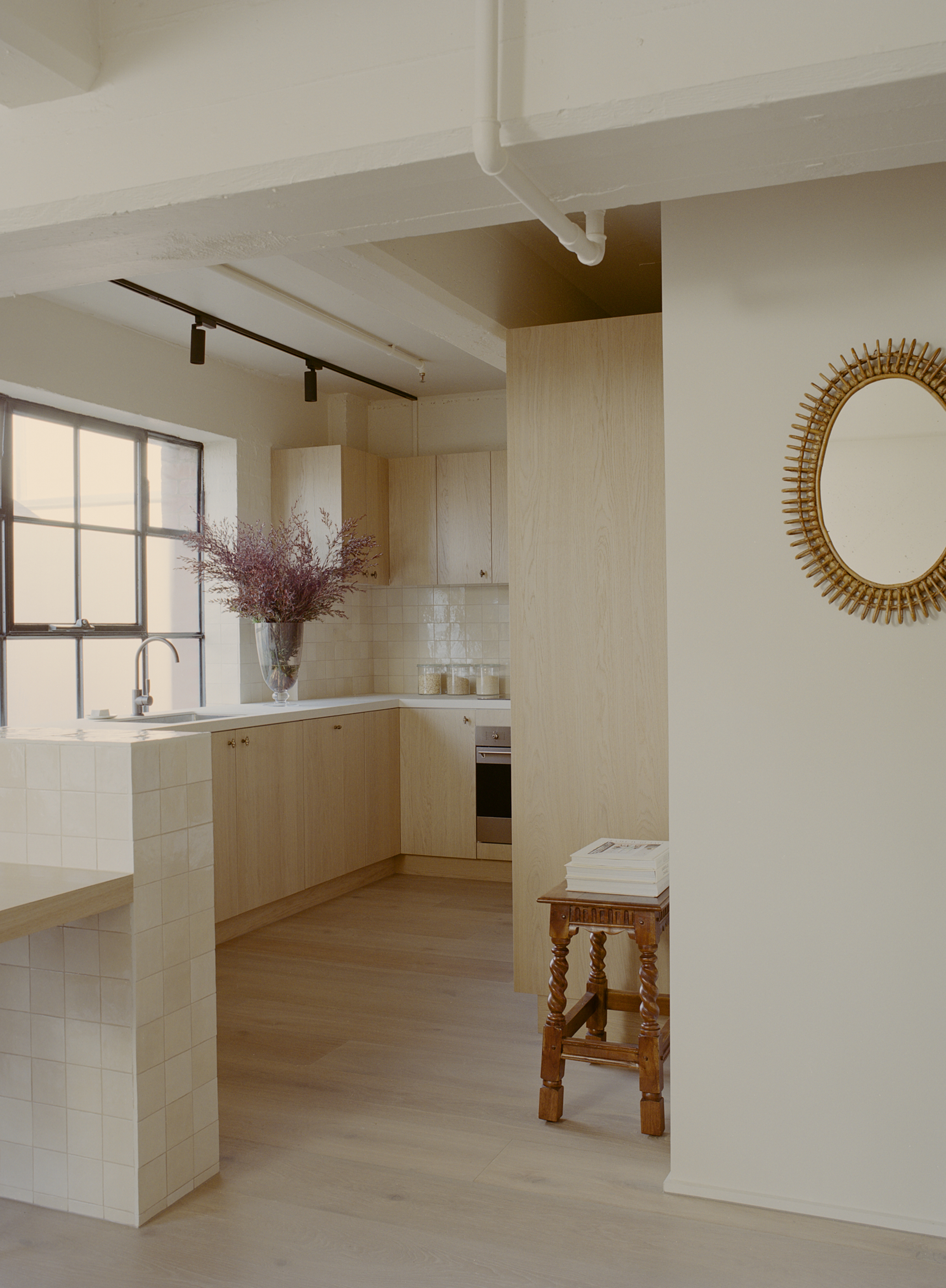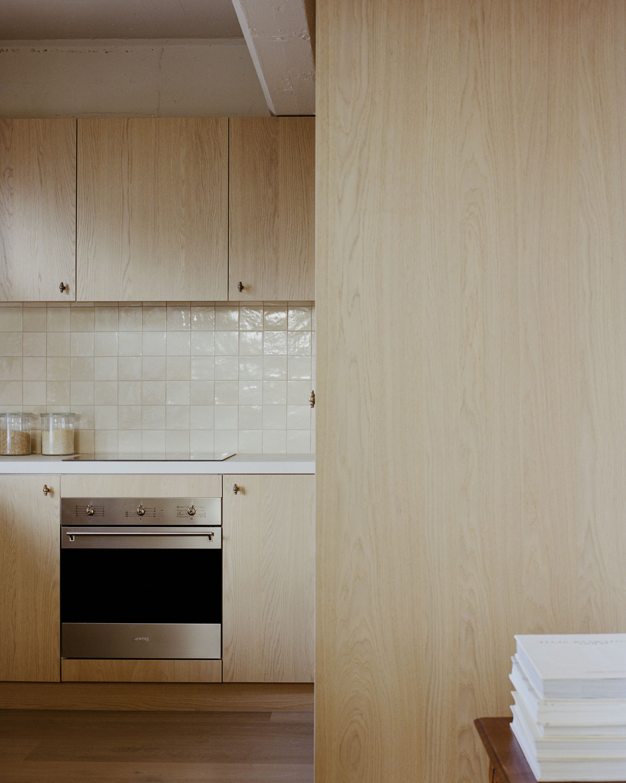 Fitzroy refines a 75 sqm apartment within the historic MacRobertson Chocolate Factory on Rose Street for a young family of three. The renovation reshapes the contained layout to prioritise warmth and comfort. Warm earth tones and tactile finishes sit naturally against the factory’s brickwork and steel-framed windows, softening its industrial character. Oak floors and light timber cabinetry add warmth, punctuated by the patina of aged brass tapware and textured tiles.