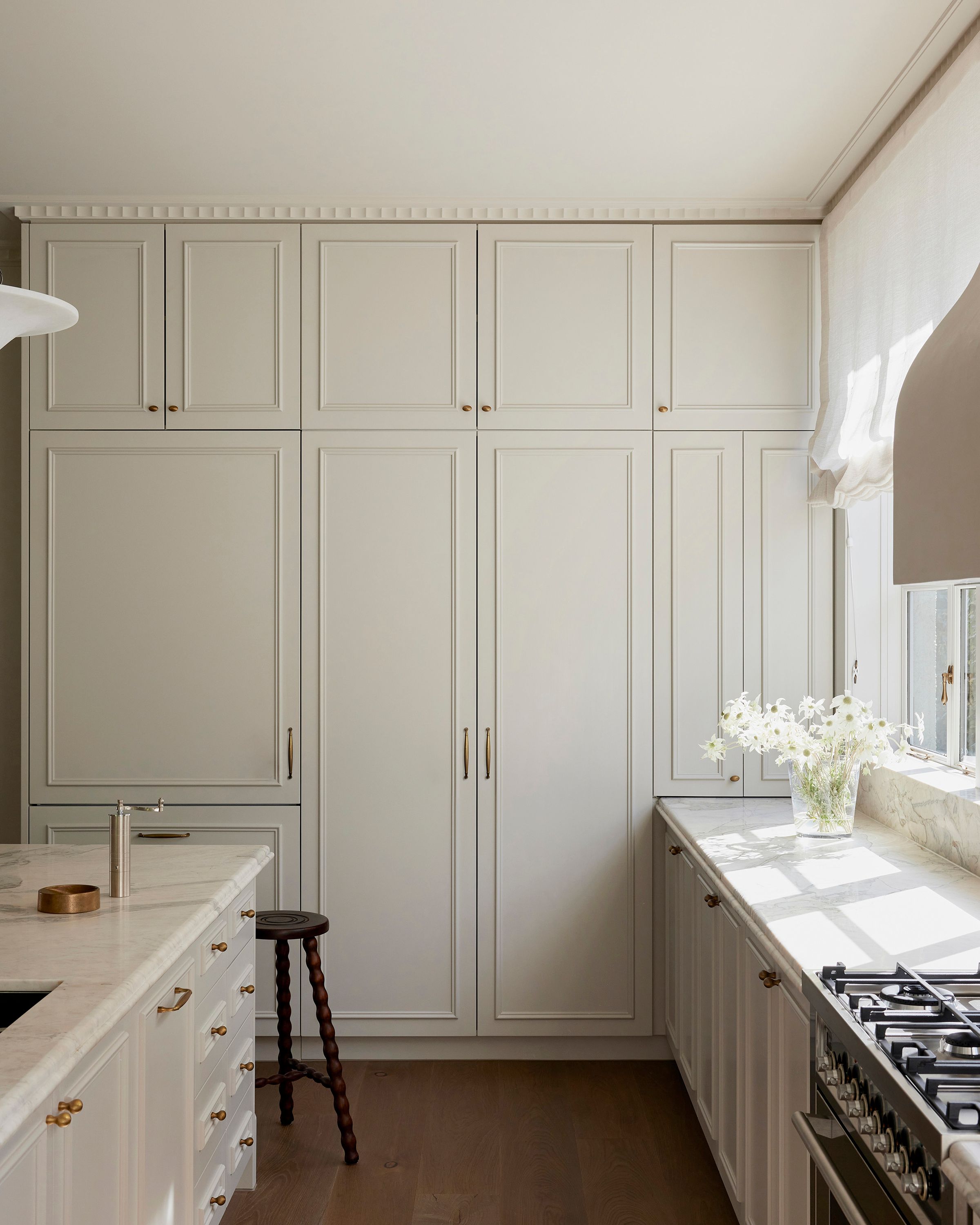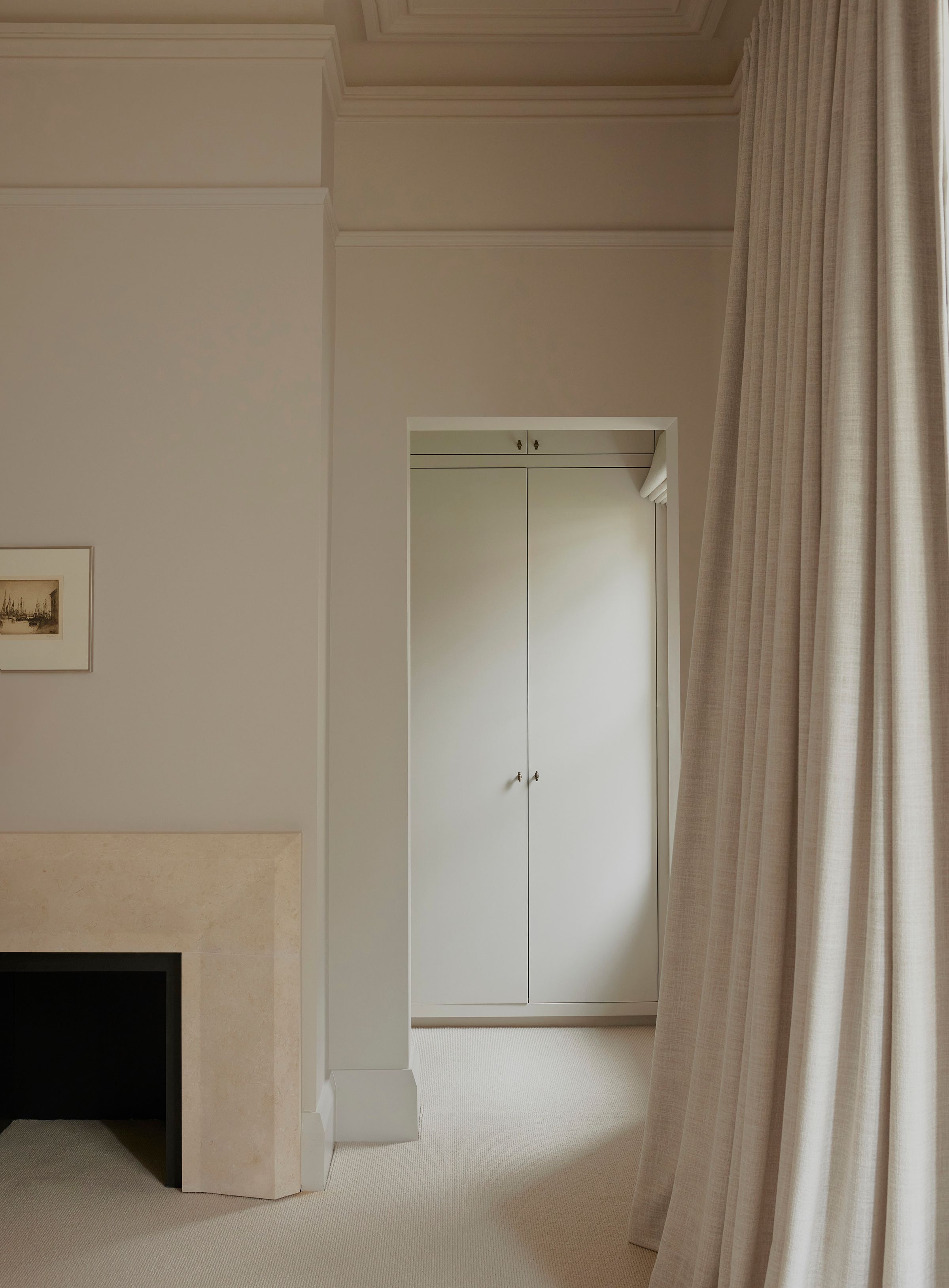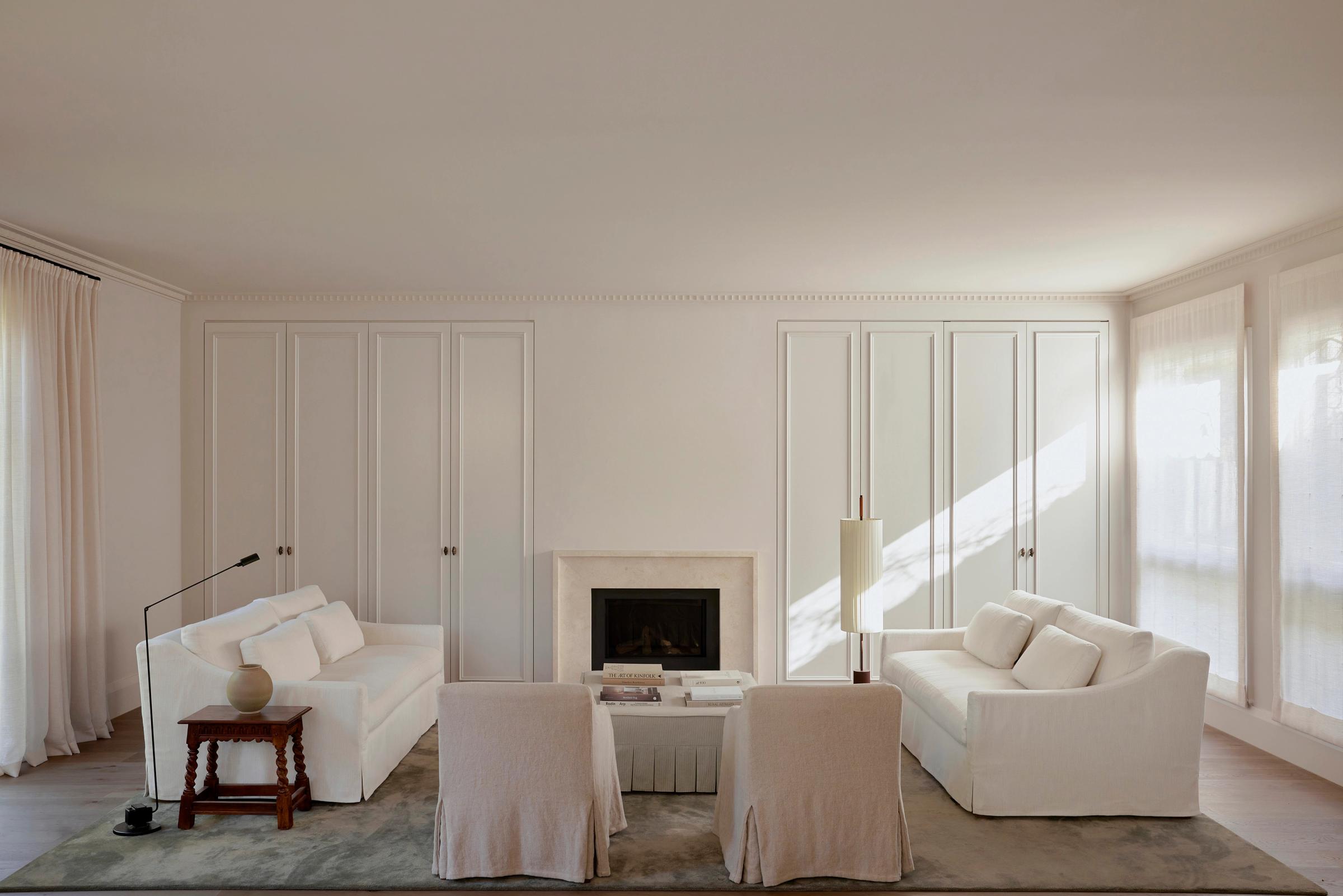Kooyong gives new life to a 1905 Federation Arts and Crafts home for a young family of four, preserving its architectural gravity while introducing light and openness. Set back from a busy road on a leafy block, the 250 sqm brick house holds presence through its thick stucco, low roof, twisted pillars and timber detailing. The rear was expanded with French windows and doors which draw the garden into daily life. Consistent tonality unifies existing elements with new additions, including custom limestone fireplaces, reinstated cornices and finely detailed joinery, each informed by the home’s immaculately preserved heritage character. This approach heightens the home’s historic charm while providing a contemporary foundation for the family to layer with their heirlooms and stories.